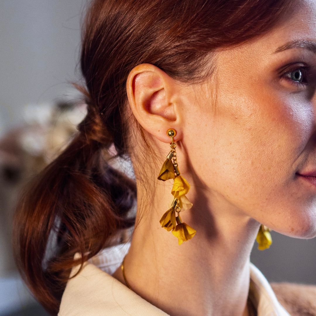 The Cascade earrings reveal a delicate cascade of flowers, bringing grace and lightness to your silhouette. Each pair, composed of preserved natural flowers, is handcrafted with care and passion in our Parisian workshop.