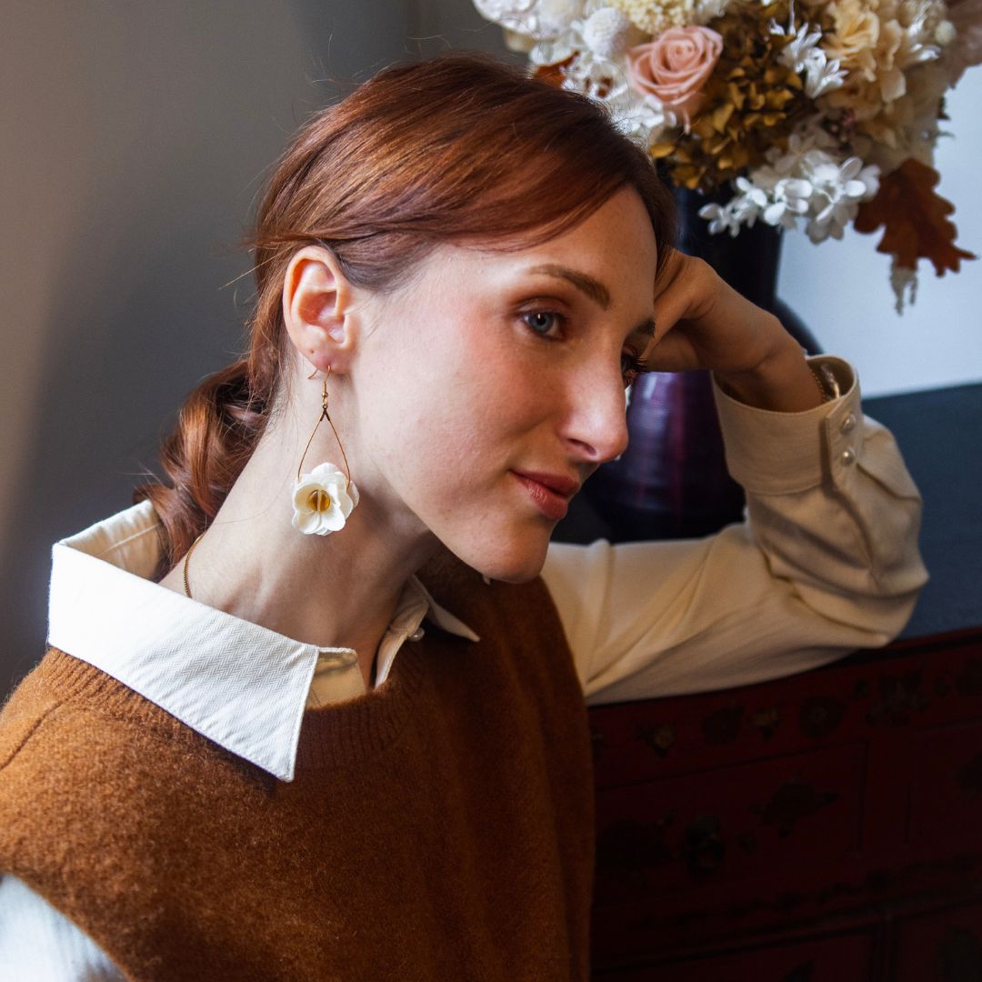 A symbol of timeless elegance, the Pensée earrings combine the delicacy of hydrangea with the refined radiance of glass pearls. Their delicate and sophisticated design is ideal for a wedding, a ceremony, or a precious gift. Each pair, composed of preserved natural flowers, is handcrafted with care and passion in our Parisian workshop.